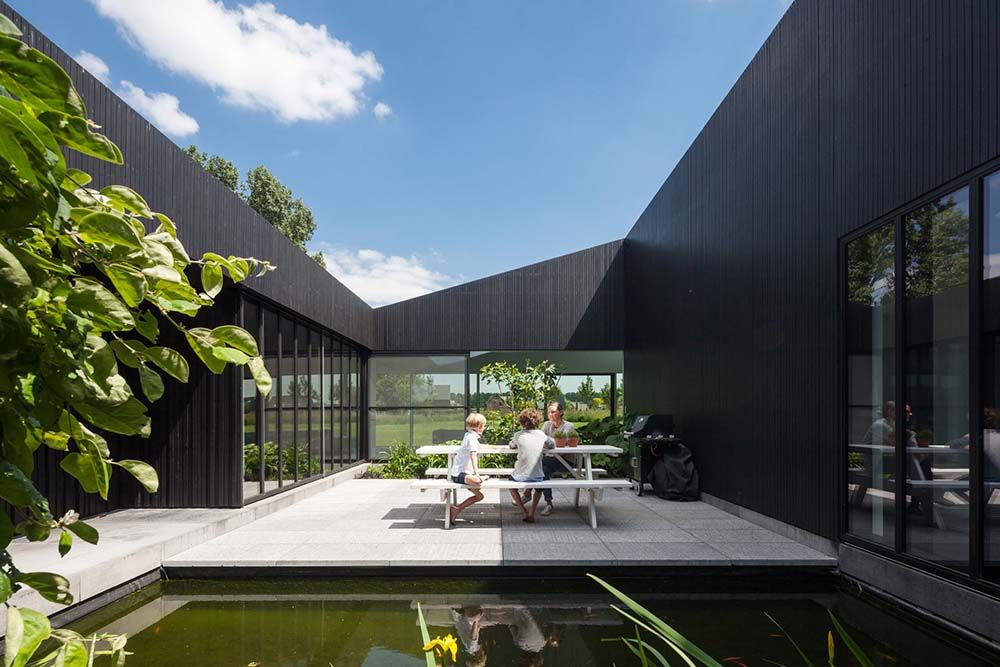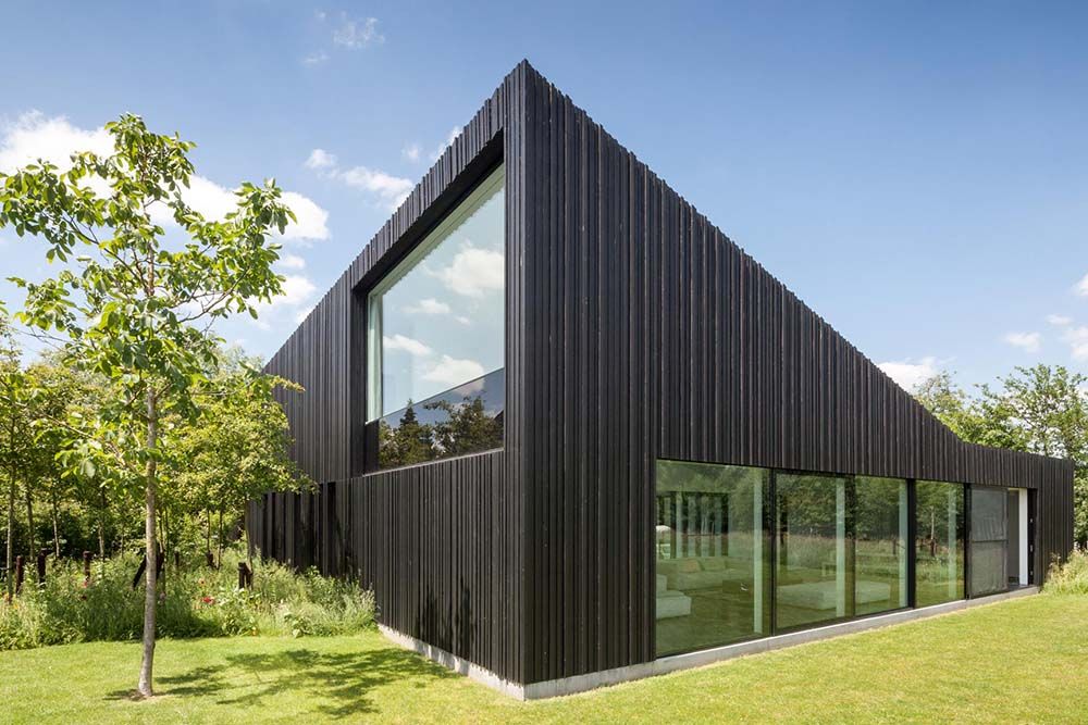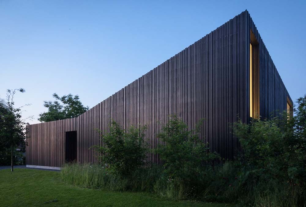 L'approche dans la conception de la façade intérieure entourant le jardin est cependant différente. Ici, les panneaux de bois ont tous la même longueur et la même épaisseur pour créer une ambiance plus cosy.