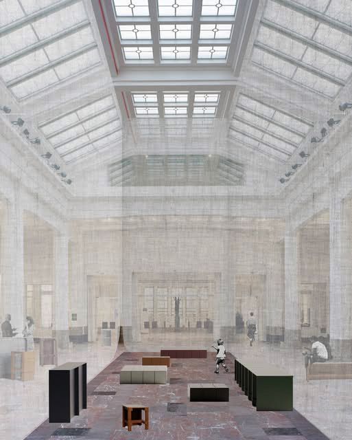 Ce projet est le fruit d’une collaboration entre l’artiste belge Michel François et le bureau d’architectes Giusto Van Campenhout, lauréats de l’appel à projets lancé en 2024 avec le soutien du Bouwmeester Maître Architecte. Leur intervention, à la fois discrète et audacieuse, dialogue avec l’architecture de Victor Horta et redonne au Hall une dimension plus humaine. Le voile monumental conçu par la designer textile Flore Fockedey crée une salle dans la salle, tandis qu’un tapis en trompe-l’œil, reproduisant les marbres originels, évoque les multiples vies de cet espace — salle des sculptures, salle des marbres, salle d’animation.