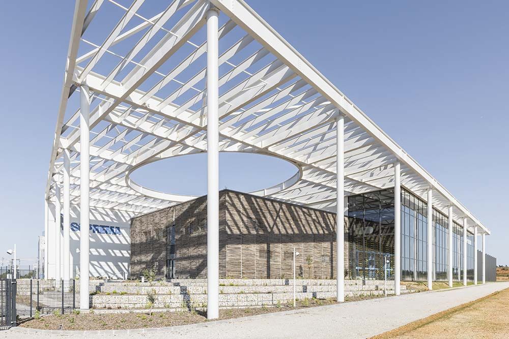 Marqueur visuel fort de l’usine, un immense auvent persienné en acier se déploie en proue du bâtiment. Sous cette structure aérienne, orné d’une double peau en bois ajourée donnant une singularité toute particulière au parallélépipède, un pavillon en R+1 abritant les locaux sociaux et un laboratoire vient se glisser délicatement. Le volume de stockage des produits finis, qui se déploie sur 170 m de long, est élégamment rythmé par de grandes failles verticales, apportant une lumière naturelle précieuse en journée et se transformant en fentes lumineuses la nuit pour donner vie à la façade. En toiture, une nappe de panneaux photovoltaïques cristallins permet de produire de l’énergie solaire dédiée à l’autoconsommation du site, participant à une démarche de transition énergétique.