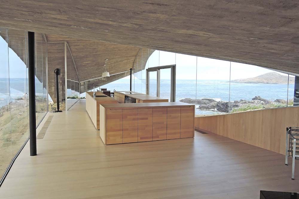 Des arches structurelles reliant les « points d’atterrissage » diagonaux permettent au toit de s’étirer et de flotter, créant une variété d’espaces ouverts et d’expériences spatiales difficilement réalisables avec des structures voûtées ou inclinées conventionnelles. La toiture fluide crée une impression de volume intérieur plus petit que l’empreinte réelle, tout en reliant visuellement et physiquement la maison aux falaises et aux vagues qui l’entourent.