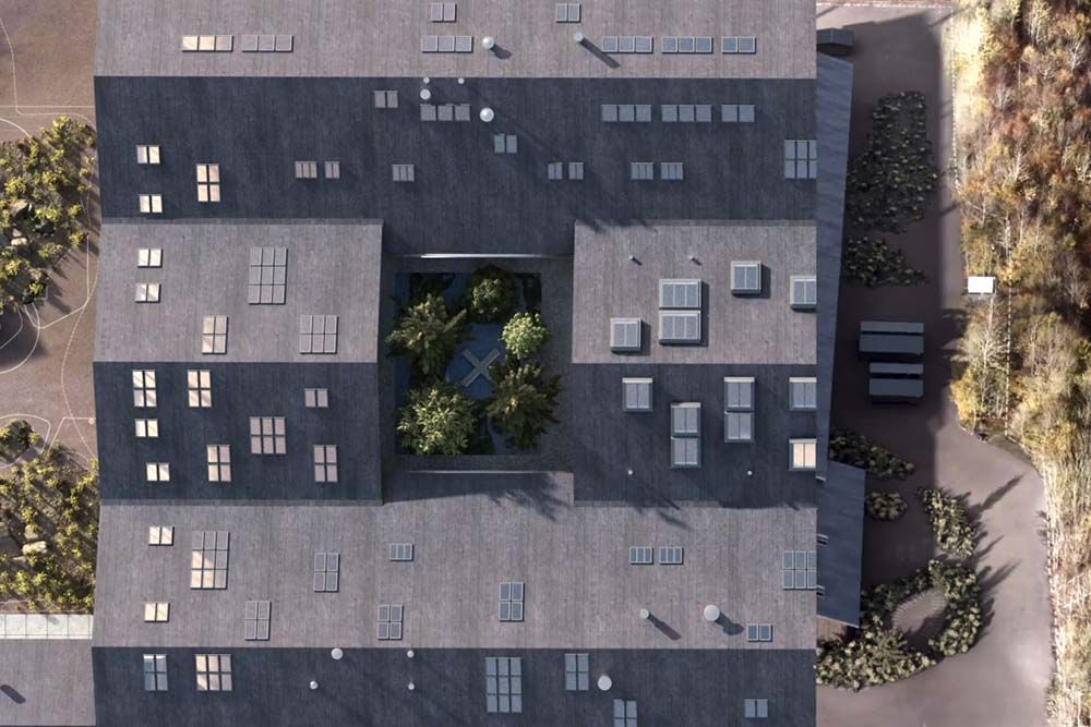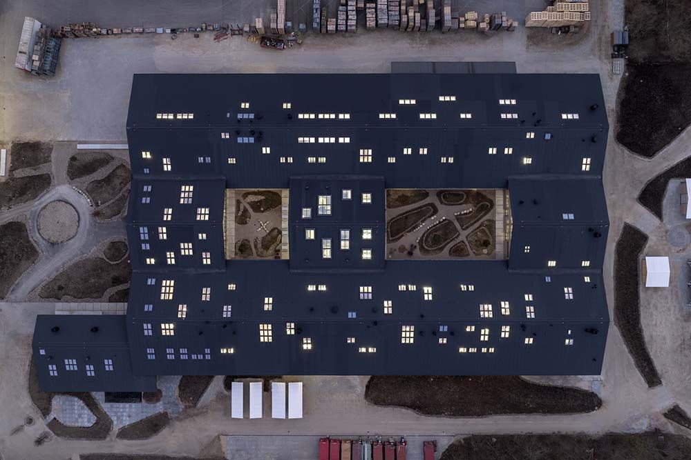 Le concours remporté par Praksis Arkitekter en 2021 a orienté le projet vers une lecture respectueuse du bâti existant : conserver la mémoire du lieu tout en le rendant flexible pour des usages futurs. La priorité n’était pas seulement esthétique, mais programmatique — créer des ateliers, des laboratoires, des espaces de co-conception et des zones d’essai qui peuvent évoluer avec les besoins de VELUX. Cette approche adaptative met l’accent sur la longévité du bâtiment et sur la valeur ajoutée de la rénovation par rapport à une construction neuve. Le langage des matériaux— structure en bois, finitions naturelles, patios et cours intérieures plantées — vise à lier étroitement intérieur et paysage, invitant la nature à entrer dans les espaces de travail et favorisant une ambiance propice à l’innovation.