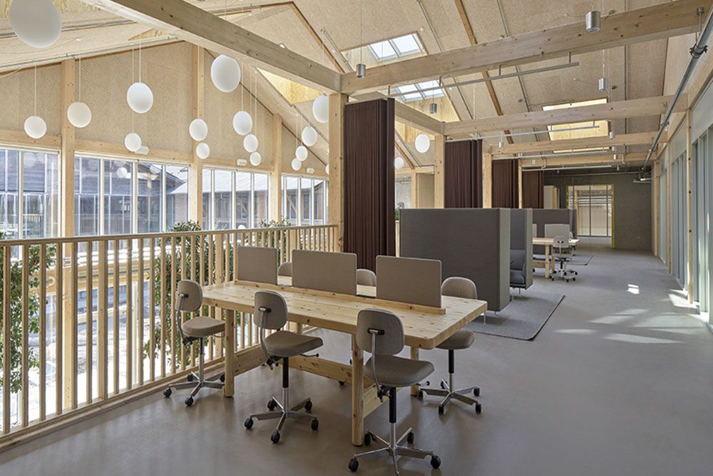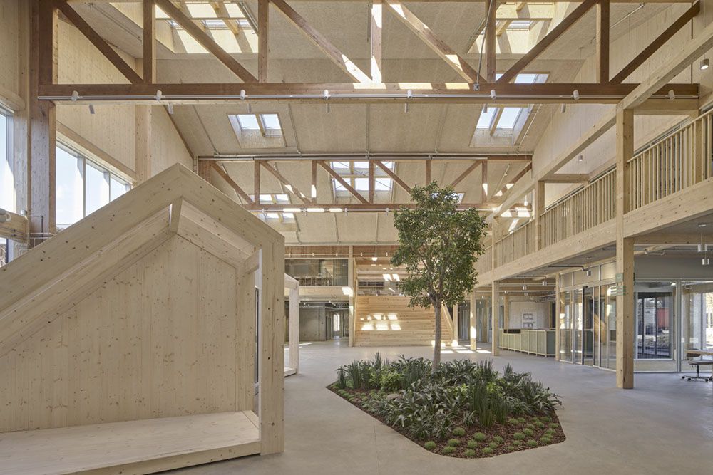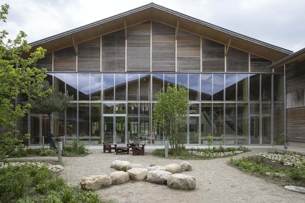 Dès l’approche, la transformation est lisible : la silhouette en bois a été préservée et réinterprétée, les façades largement vitrées laissent pénétrer la lumière naturelle et les volumes intérieurs privilégient les transparences et la modularité — autant d’éléments pensés pour favoriser la collaboration, la créativité et le bien-être au travail. Le parti pris est clair : réinvestir et requalifier plutôt que raser et reconstruire, une décision qui a guidé l’ensemble du projet.