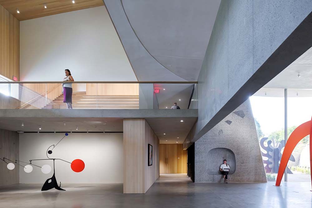 À l’intérieur, les galeries serpentent entre des murs de béton clair, des ouvertures tamisées et des perspectives vers le ciel. Les mobiles et stabiles de Calder, suspendus dans des puits de lumière, semblent flotter dans un calme presque religieux.