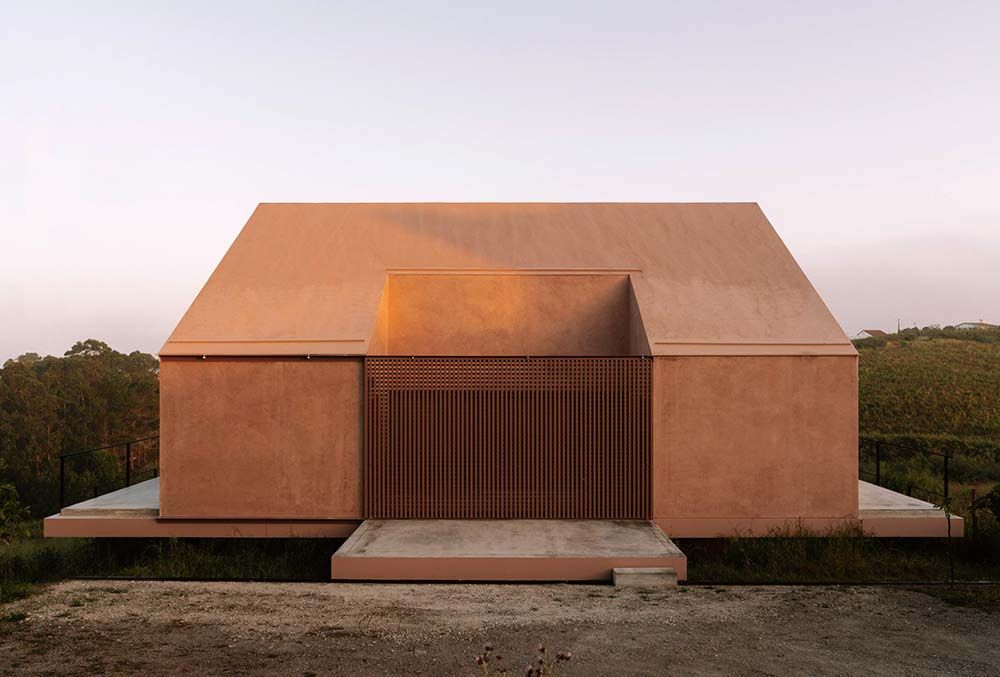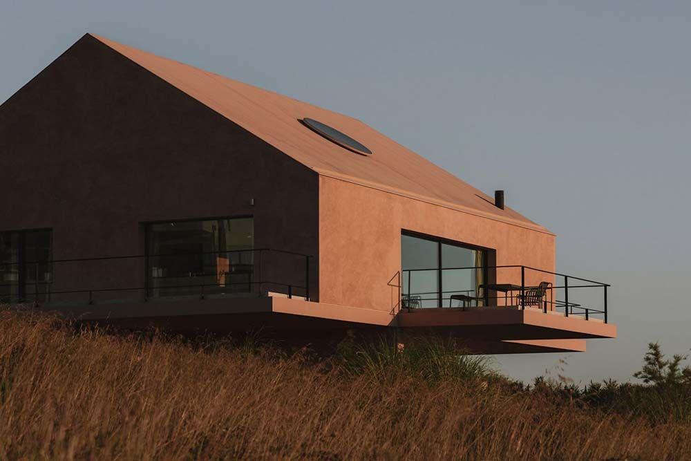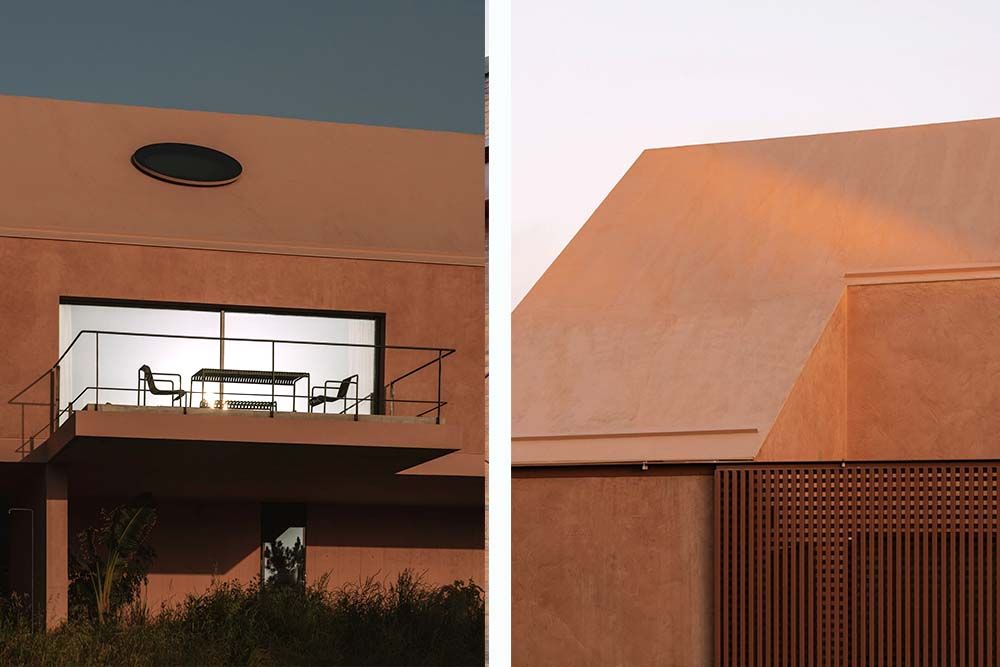 Une forme minimaliste à pignon, des terrasses en porte-à-faux et un enduit à la chaux couleur terre caractérisent Casa Plaj, une maison de vacances portugaise conçue par l’agence locale Extrastudio.