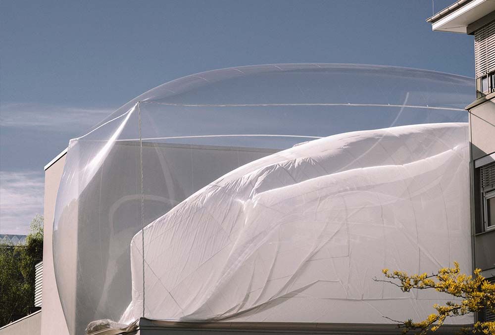 Fabriquée à partir de soie de parachute déclassée, matériau ultra-résistant, mais d’une légèreté vaporeuse, la membrane transparente absorbe et libère l’air à intervalles réguliers.