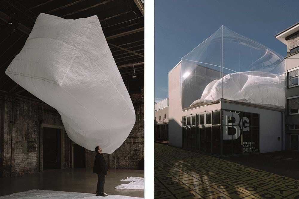 L’objet, réalisé en soie de parachute blanche recyclée, absorbe et libère l’air à intervalles prédéfinis. Cette répétition ininterrompue évoque le changement constant : au musée, où les expositions et l’architecture muséale sont régulièrement montées puis démontées ; dans la ville, en perpétuelle évolution ; et dans tous les matériaux qui s’érodent presque imperceptiblement au fil du temps.