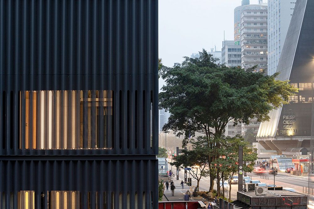 L’extension, réalisée par METRO Arquitetos Associados, respecte l’échelle et le langage du bâtiment d’origine, évitant de rivaliser avec sa monumentalité. Le nouveau volume, un prisme sobre sur une base transparente, est relié au MASP par un passage souterrain qui facilite l’intégration fonctionnelle entre les deux bâtiments et permet d’optimiser la circulation du public et le déplacement des œuvres d’art. Ce projet de transformation impliquait un double défi : adapter un ancien immeuble à usage d’habitation aux exigences contemporaines d’un musée et créer un nouveau musée qui dialoguerait avec l’héritage architectural et symbolique de Lina Bo Bardi.