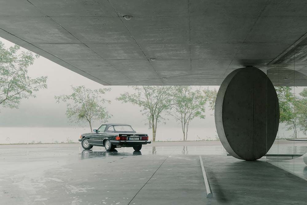 En arrivant au lac, le premier contact avec le complexe hôtelier n’est pas un hall d’entrée, mais une ligne de béton se détachant sur le ciel. Un auvent carré et bas semble flotter au-dessus d’un noyau circulaire unique, dont les bords s’étirent jusqu’à se fondre presque dans les contreforts des collines.