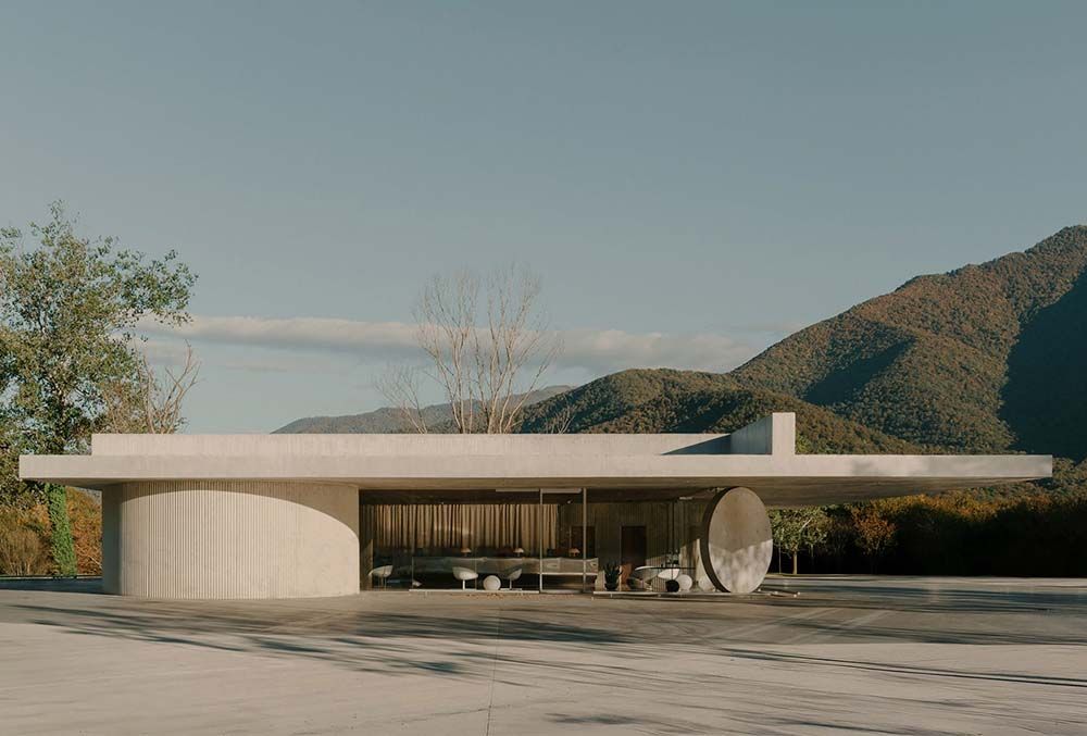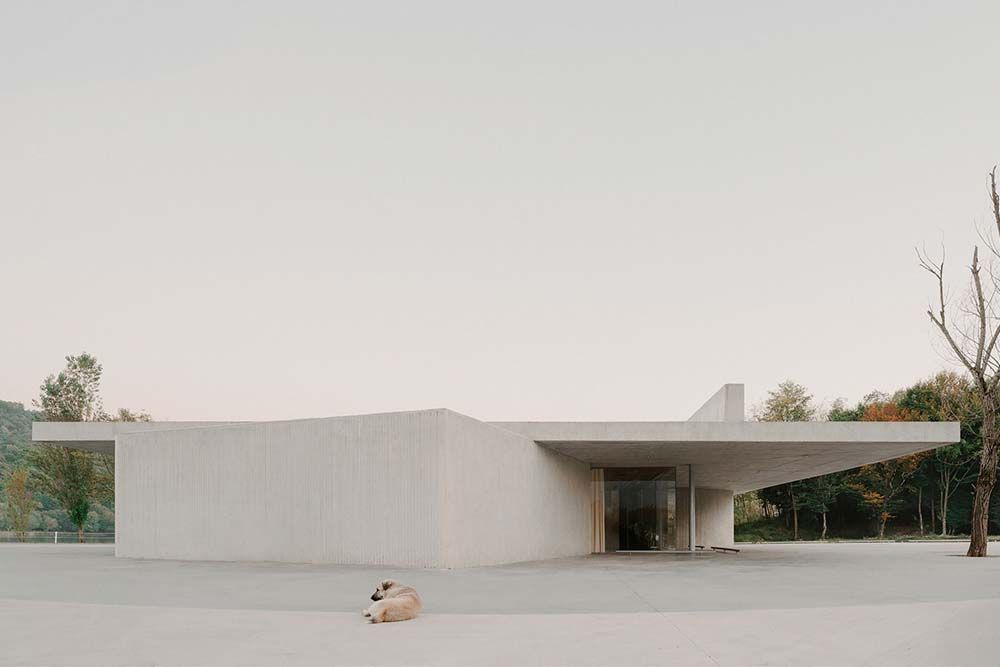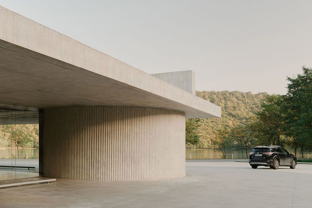 Au lac Kvareli, dans l’est de la Géorgie, un pavillon de béton suspendu, conçu par David Giorgadze Architects, transforme l’arrivée à un complexe hôtelier en une douce transition du parking à la forêt, de l’asphalte à l’eau et à la lumière.