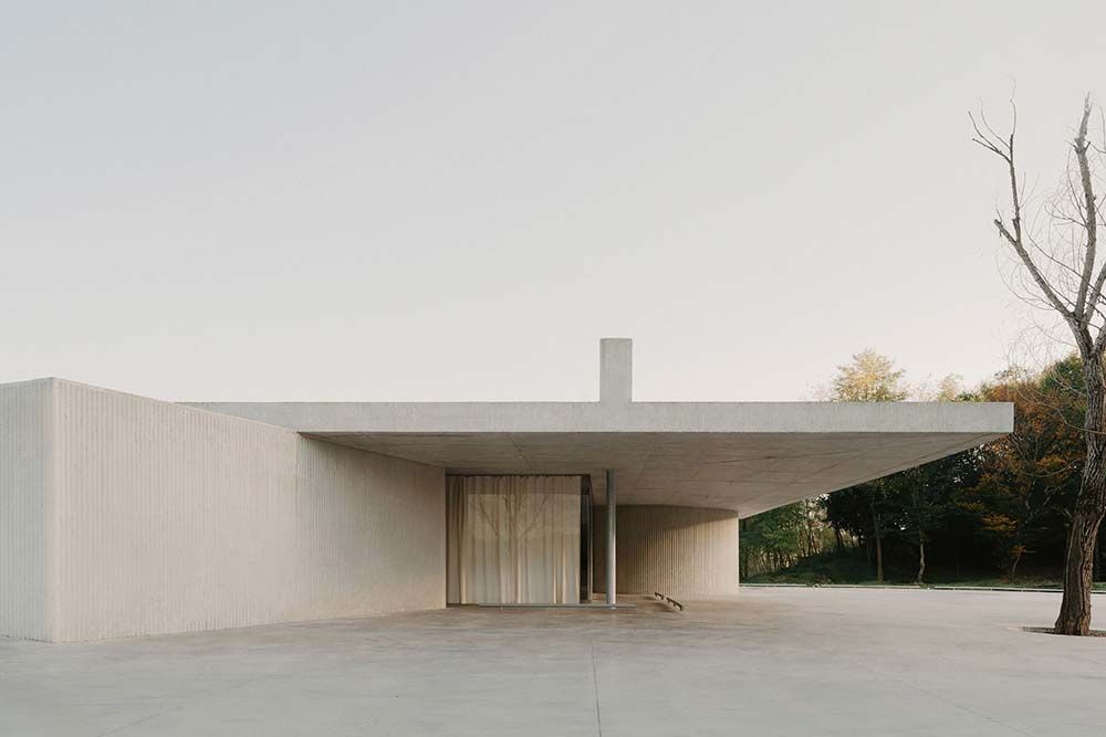 L’architecture se réduit à quelques éléments précis. Une dalle de toiture en béton armé repose sur quatre supports : un volume cylindrique abritant les sanitaires, un bloc carré regroupant les espaces techniques et deux colonnes élancées qui semblent porter plus de lumière que de charge. Entre eux, de vastes baies vitrées et des ouvertures forment un espace d’accueil à 360 degrés où intérieur et extérieur se fondent harmonieusement.