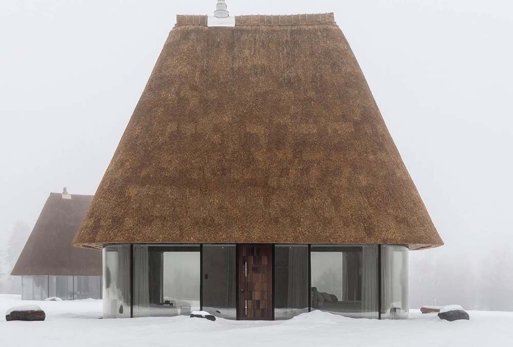 En journée, les façades entièrement vitrées se fondent visuellement, donnant l’impression que l’imposant toit de chaume flotte au-dessus du paysage. À l’intérieur comme à l’extérieur, le sol est recouvert d’un tapis de pierre continu, agréable au toucher et offrant une subtile sensation de massage lorsqu’on marche pieds nus.