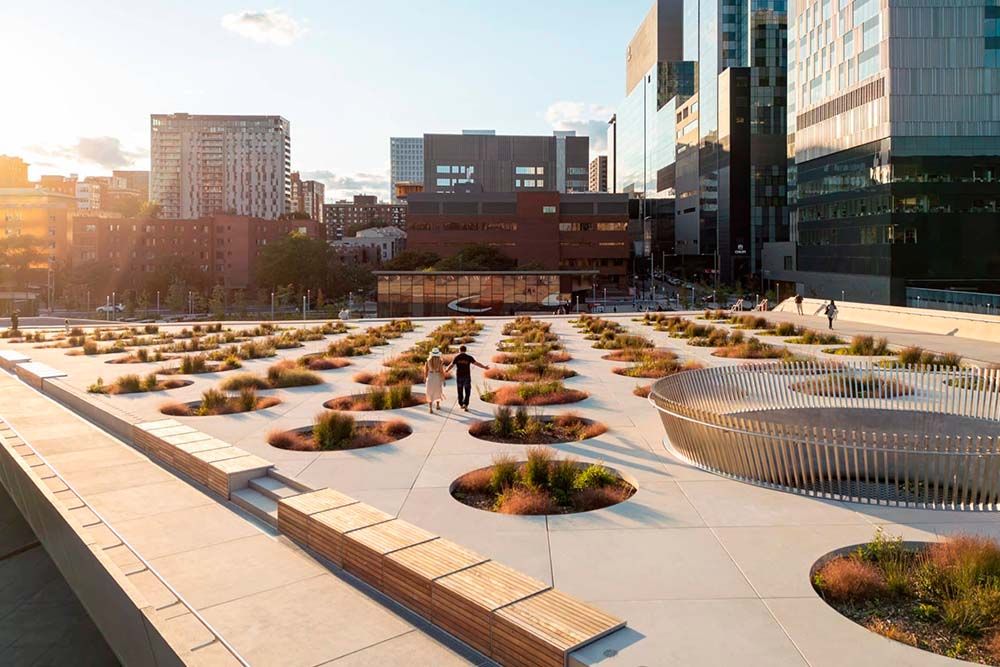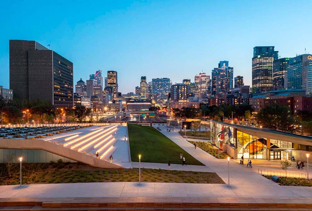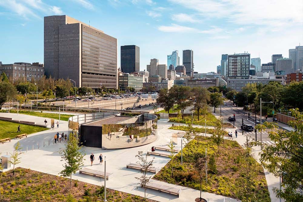 Ce concept, lauréat d’un concours international d’architecture de paysage pluridisciplinaire lancé par la Ville de Montréal en 2017, mobilise tout le potentiel d’une approche architecturale par stratification, et transforme la cicatrice urbaine en destination animée : une place multifonctionnelle qui est à la fois lieu de mémoire inclusif, parcours universellement accessible et contribution à la biodiversité urbaine.