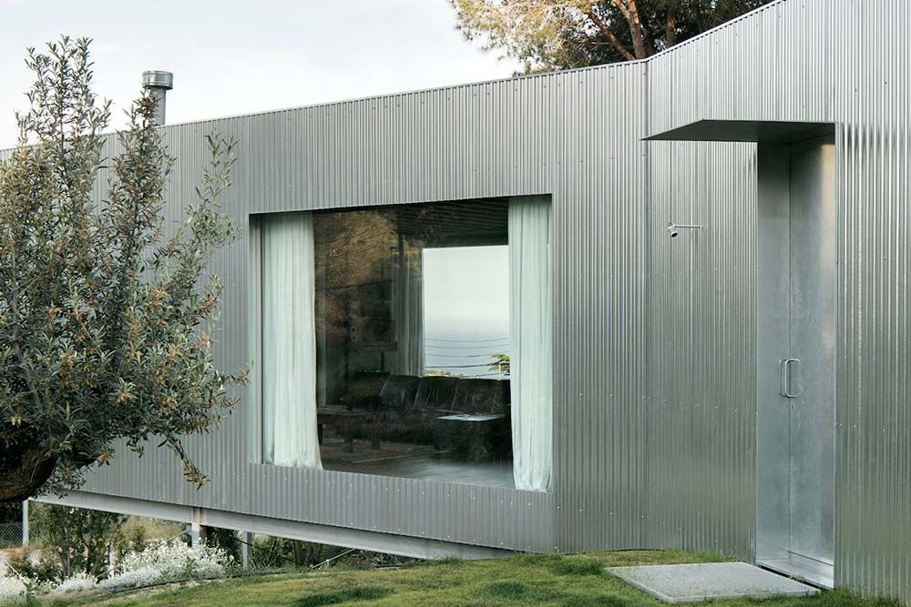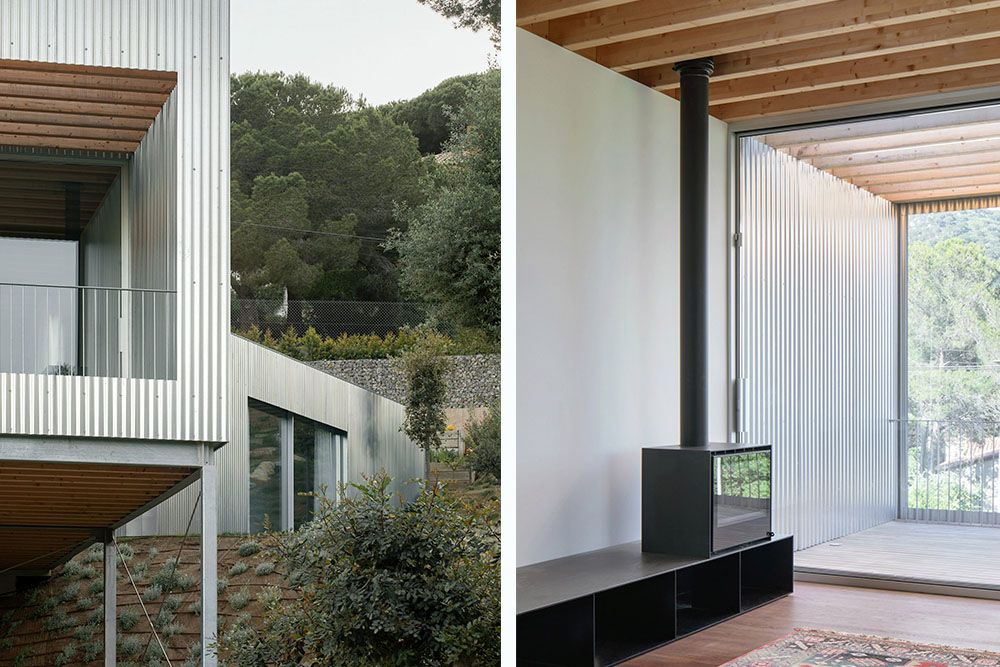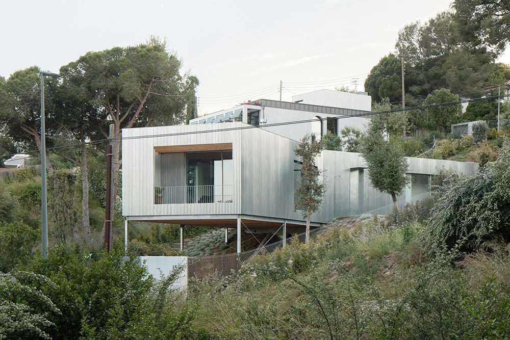 Les agences d’architecture locales Jaime Prous Architects et Pineda & Monedero ont achevé la Casa 144º, une maison revêtue de tôle ondulée, située près de Barcelone et perchée sur de fins pilotis d’acier au-dessus d’un terrain en forte pente.