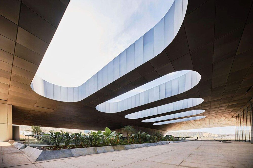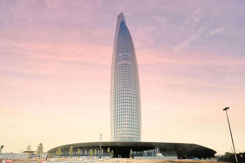 D’une superficie totale de 102 800 m², la tour abrite un programme mixte ambitieux : un hôtel de luxe Waldorf Astoria, des bureaux, des appartements haut de gamme ainsi qu’une plateforme panoramique offrant une vue imprenable sur la région. Conçue par les architectes Rafael de la Hoz et Hakim Benjelloun, elle est desservie par 36 ascenseurs, dont 21 dans la tour elle-même et 15 dans le podium.
