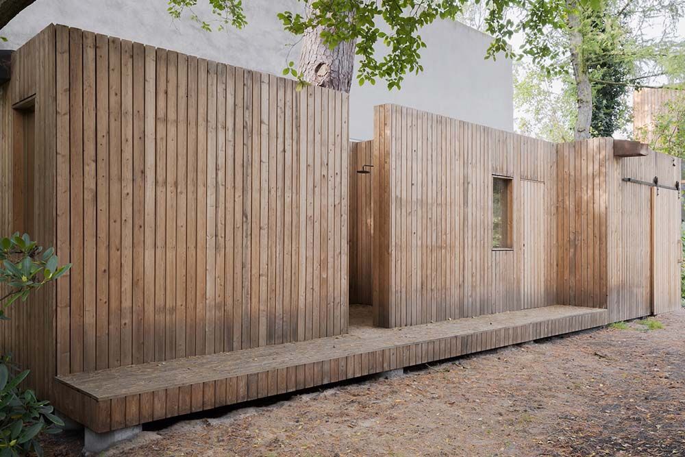 Au-delà de la maison principale, le projet se prolonge dans un pavillon discret dédié au bien-être : sauna, douche extérieure, refuge en bois brut dissimulé dans le jardin. Une architecture secondaire, presque invisible, qui prolonge l’expérience sensorielle du lieu.