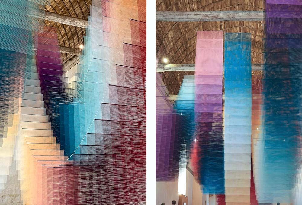 Tel un flot chromatique, des vagues colorées se déploient dans la chapelle. Suspendues, elles envahissent l’espace redéfinissant notre perception des volumes et des plans. L’architecture se transforme en une œuvre vivante où les couleurs et les formes s’entrelacent pour créer une expérience poétique et immersive.