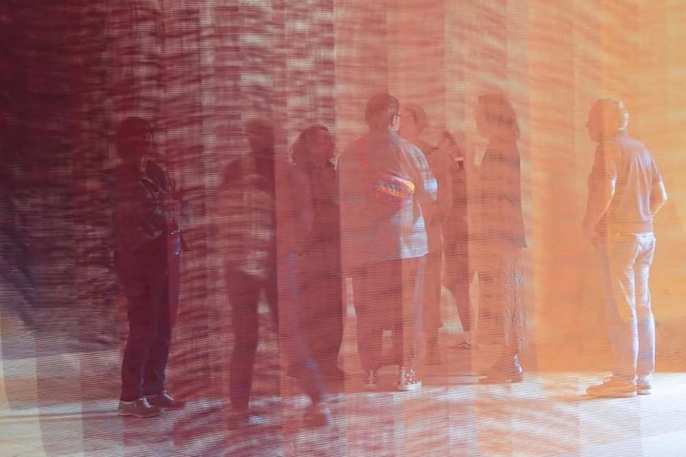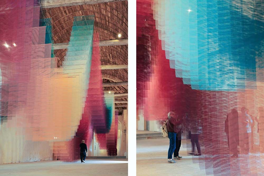 Superposés en couches méticuleusement suspendues au plafond, les panneaux interagissent avec la lumière du soleil et entre eux pour créer des dégradés vibrants.