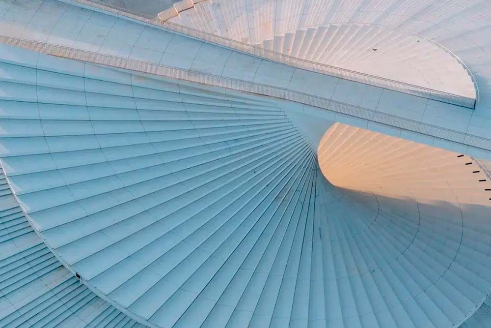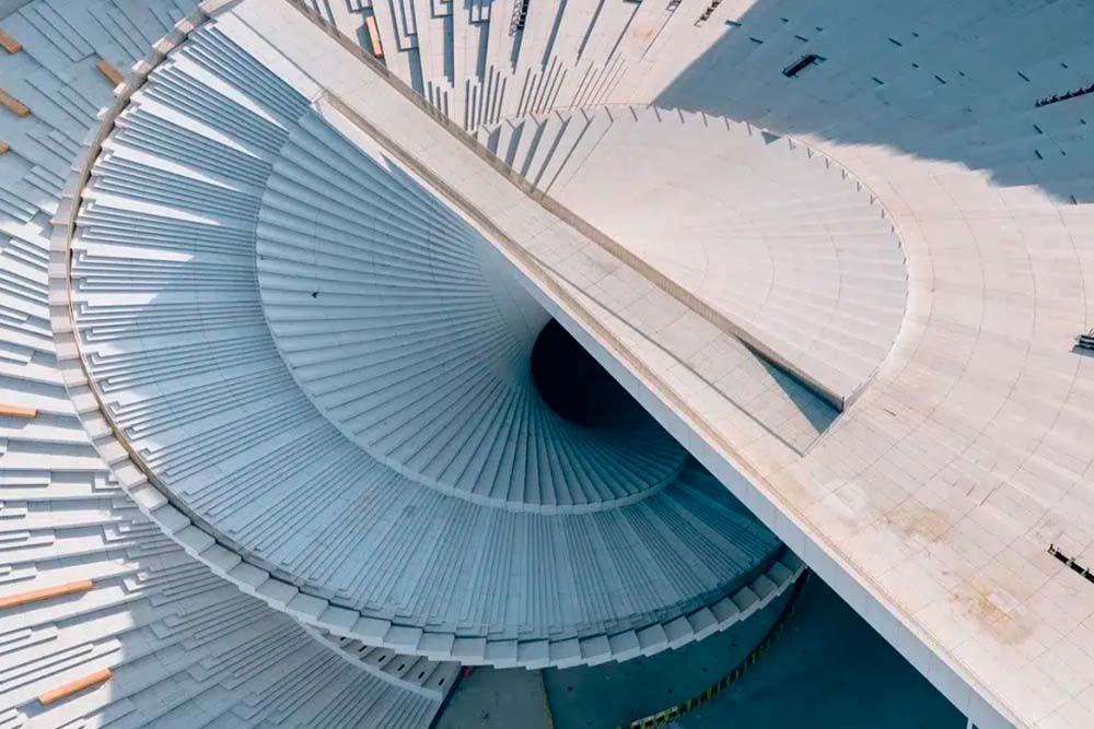 Dès le premier regard, l’architecture affirme sa force expressive. Le bâtiment se déploie comme un éventail en mouvement, évoquant la danse et la souplesse du corps. Sa toiture en spirale, pensée comme un immense escalier ascendant, dépasse la simple prouesse formelle : accessible à toute heure, elle invite le public à s’approprier le lieu, à la fois promenade, scène urbaine et point de vue sur la ville. Par ce geste ouvert, l’Opéra s’inscrit pleinement dans le quartier écologique de Houtan, affirmant sa vocation civique autant qu’artistique.