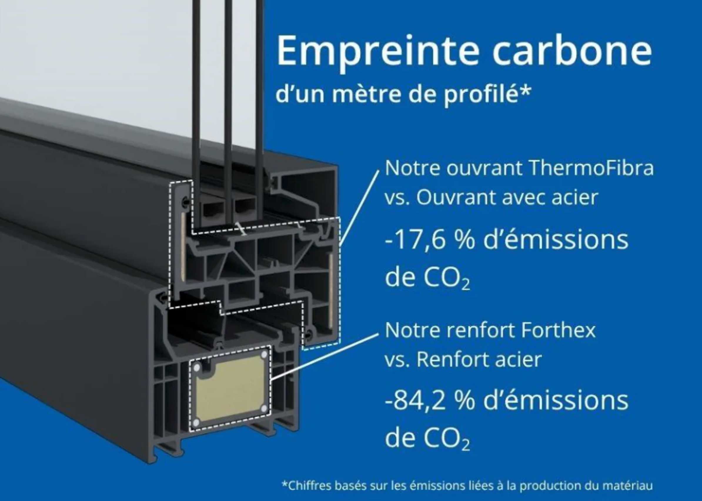 Le renforcement en acier et l'utilisation de matériaux recyclés dans les profilés de fenêtres ou de portes sont aujourd'hui la norme sur le marché. Deceuninck utilise également des matériaux recyclés et de l'acier dans ses produits. Avec les profilés de fenêtre Elegant, l'entreprise va toutefois au-delà de la norme. Grâce à la technologie de renforcement Forthex, l'acier est entièrement supprimé du cadre. Cela se traduit par un poids réduit, une meilleure performance thermique et une réduction considérable des émissions de CO₂ : plus de 84 % d'émissions en moins par mètre de profilé. De plus, si les ailes sont renforcées avec la fibre de verre ThermoFibra, les performances sont encore meilleures et l'empreinte écologique diminue davantage, de plus de 17 % par mètre de profilé.