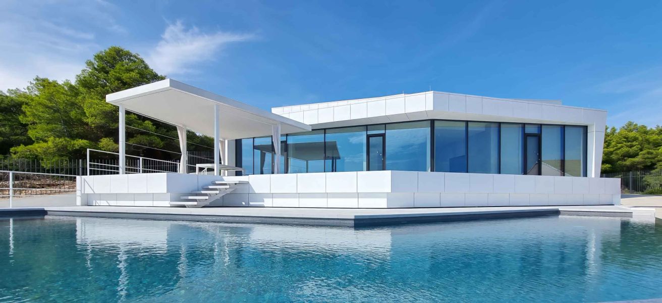 La façade joue un rôle central dans le projet et a été réalisée en panneaux Kerrock solid surface. Des panneaux blancs sont disposés et assemblés selon différents angles, créant un ensemble dynamique et sculptural, évoquant des formes maritimes. L’alternance des plans et des lignes génère un subtil jeu d’ombres et de profondeur, donnant à la façade un caractère évolutif au fil de la journée. Associée aux volumes en porte-à-faux, cette géométrie renforce l’impression d’une architecture semblant flotter au-dessus du terrain.