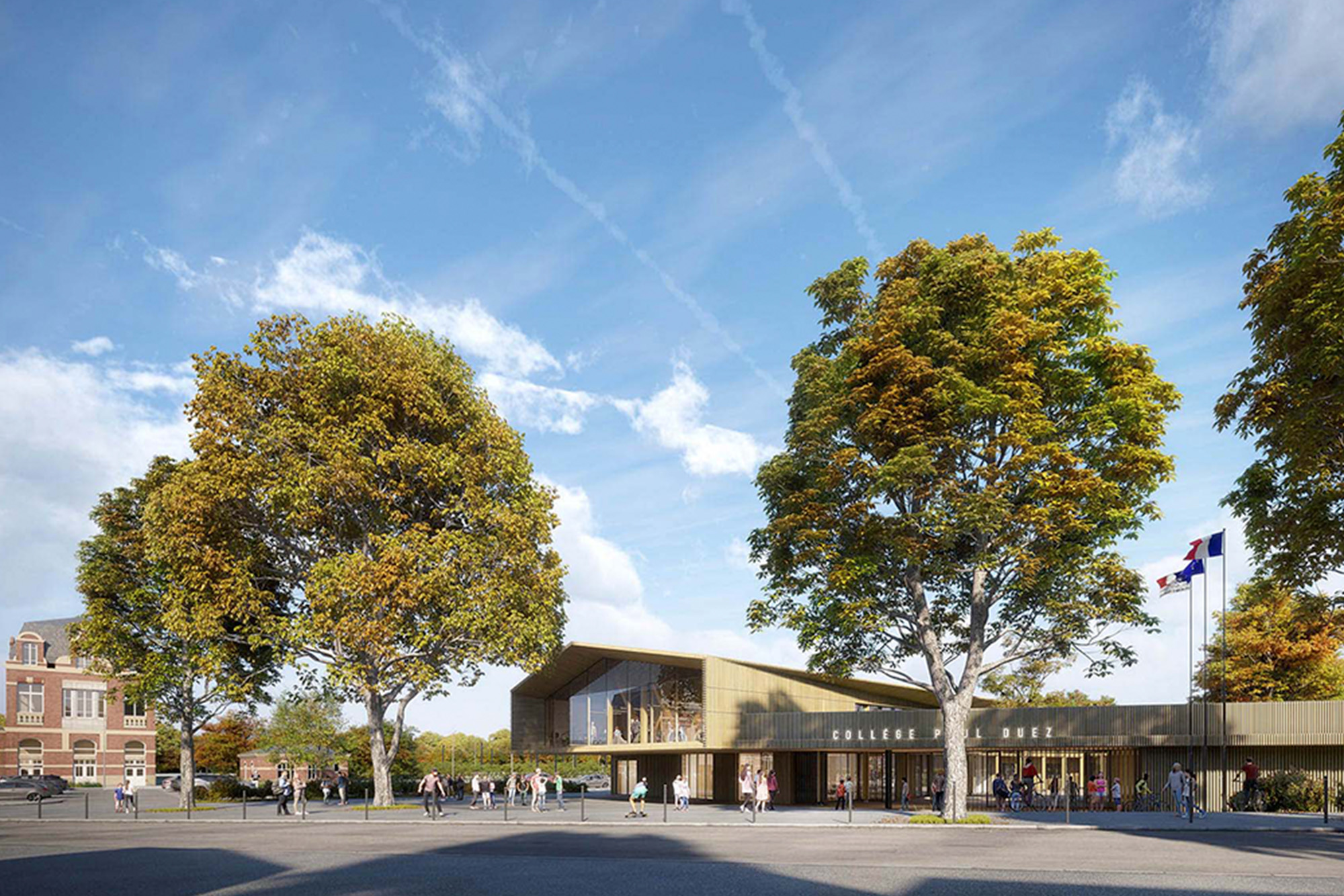 Le studio d’architecture français Coldefy, en collaboration avec Relief Architecture, a achevé le Collège Robert Badinter, la première école à ossature bois du Nord de la France, pouvant accueillir 650 élèves. L’école est implantée sur un ancien terrain de triage, à proximité de la gare de la ville et à dix minutes à pied du centre-ville. La conception et l’emplacement de cette nouvelle école s’inscrivent dans un projet de renouvellement urbain visant à créer un pôle de transport en commun consolidé, complété par des équipements civiques animés. Situé sur l’emplacement du fossé des fortifications Vauban de la ville, le site contenait également des catiches – des carrières de craie souterraines – qui ont dû être remblayées afin de stabiliser le terrain avant la construction.