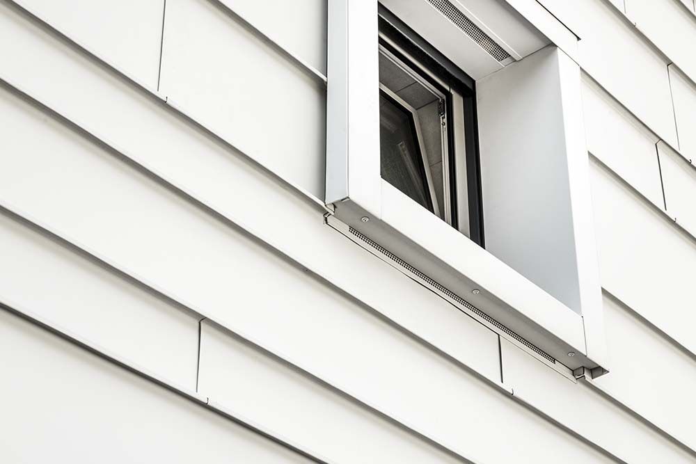 La réalisation illustre une précision constructive remarquable. En quelques mois, 1.700 m² de toiture et 2.100 m² de façade ont été posés. Les bandes de PREFALZ, préfabriquées sur mesure, sont installées horizontalement avec des largeurs variables. Chaque ouverture s’aligne soigneusement sur les lignes de pliage, créant un rythme qui structure les volumes et accentue leur proportion.
