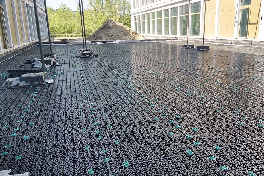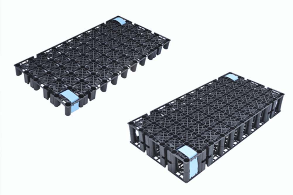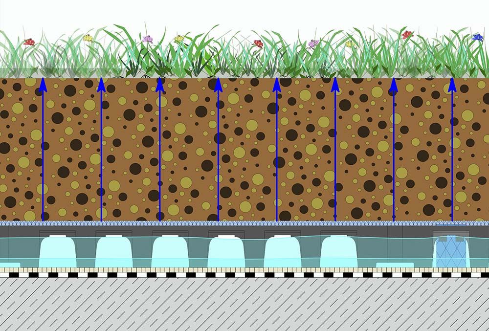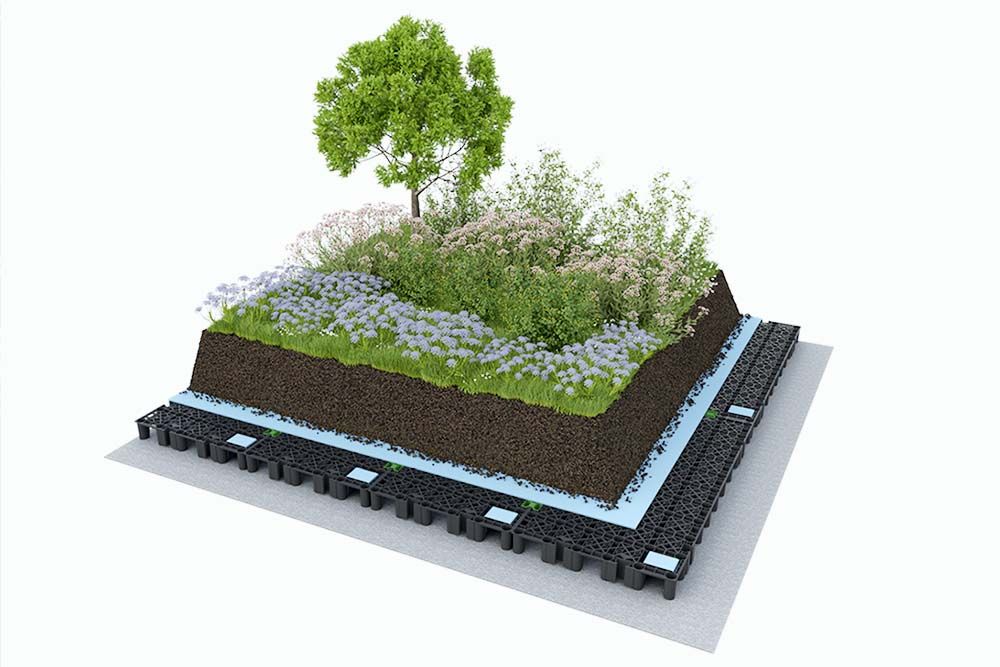 Optigrün Benelux, pionnier et leader européen des toitures végétalisées et des toitures-jardins, a développé à cet effet des boîtes de rétention innovantes (WRB), d'une capacité de stockage exceptionnelle pouvant atteindre 161 litres par mètre carré. Ces boîtes sont entièrement fabriquées à partir de polypropylène recyclé et peuvent être utilisées sous les toitures végétalisées, les jardins sur toiture et les toitures accessibles ou carrossables. Grâce à leur haute résistance à la compression (±800 kN/m²) et à leur faible poids propre, elles conviennent aussi bien aux nouvelles constructions qu'aux rénovations, même en cas de structure de toiture limitée.