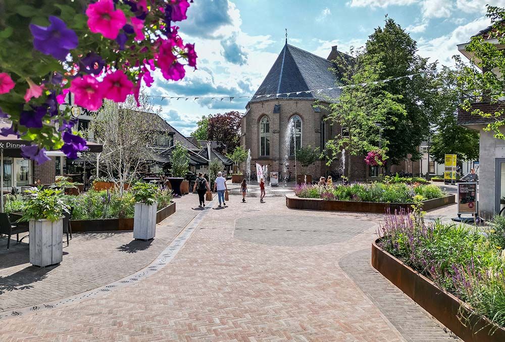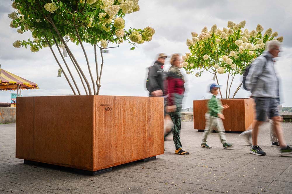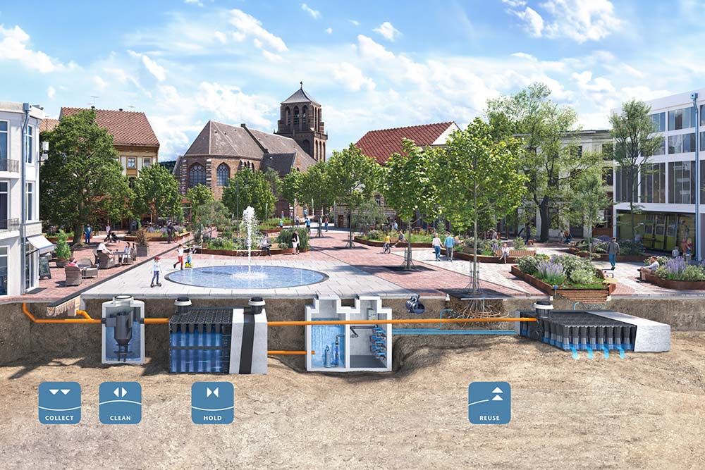 Dans la commune néerlandaise de Raalte, ACO et « IAA Architecten » ont associé gestion intelligente de l’eau et esthétique. Une grille en acier corten ornée du symbole de l’épi de blé guide l’eau sur la place. En sous-sol, le système collecte, purifie et stocke l’eau pour une réutilisation. Des capteurs mesurent l’humidité du sol et pilotent l’irrigation. « L’arrosage ne s’active que si le sol est sec et qu’aucune pluie n’est prévue », précise Chris Beeren, Expert de produit chez ACO.